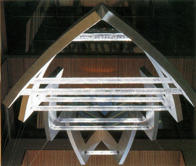 The sculpture’s prism effect refracts natural light entering the atrium, creating a harmonious balance of light and shadow.
